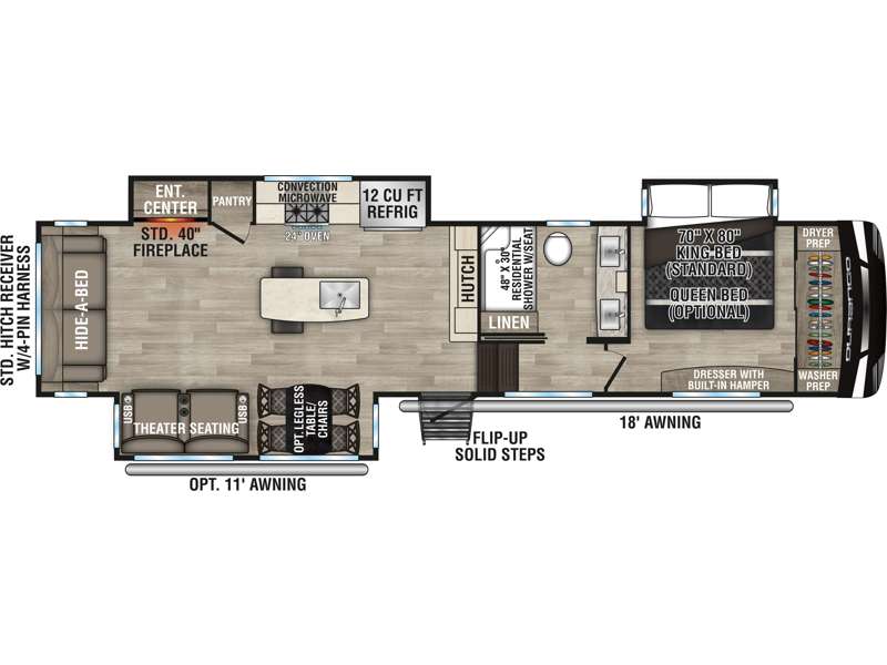 Enjoy full time living, an affordable price, and a wide body construction for more living space with every one of these KZ Durango light high-profile fifth wheels! These luxury units can be used all year round with the all-weather insulation package, the 3" x 14" foam-core in-floor straight-line heating system w/ a 35,000 BTU furnace, and the 15,000 BTU ducted roof A/C which optimizes the airflow by an average of 40% for better performance, cooling time, and reduction of noise. A few other construction features you will appreciate include a one piece, seamless walk-on Tufflex roofing material, Pex® in-floor heated waterlines, a Lamilux® gelcoat fiberglass exterior, and Dexter® axles with self adjusting brakes and height adjusting hangers. You can even head to the woods and go off-grid when you choose the optional off-the-grid solar package. Modern farmhouse cabinetry, a king size bed, and smart TVs will have you feeling like you never left home!