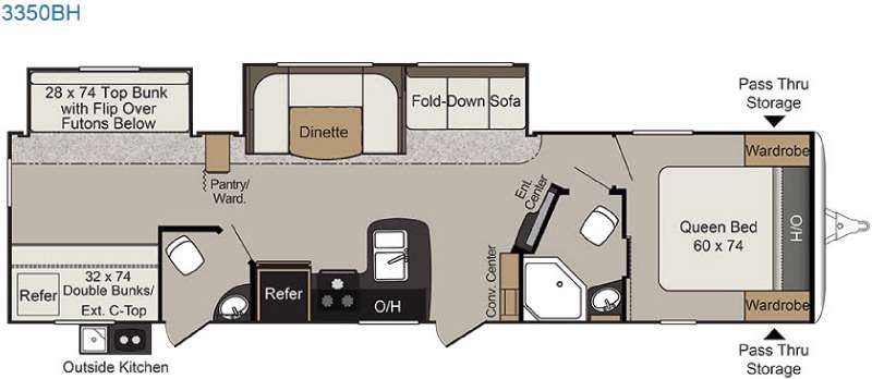 The rear of the unit features a bunkhouse for kids or extra guests. There are flip over futons that slide out with a 28" x 74" top bunk above. Across from those you will find a set of bunks that are 32" x 74". Next to the bunkhouse is a half bath with a toilet and sink, plus entry from the living area or from outside. A pantry/wardrobe is just across from the bath door to be utilized as you wish.