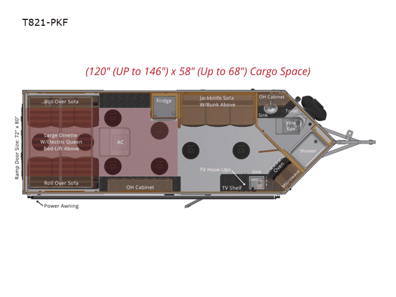 The T-821PKF Traxx Edition is the largest model in the lineup and it has lots of great features! The standard bathroom includes a sink, toilet, and shower, with an overhead vent fan. The kitchen adds a sink and refrigerator to the oven and microwave found on smaller models. A power awning enhances the outdoor space as well. The flexible cargo area has multiple tie-downs to keep your toys secure. Sleep capacity of seven includes a pair of roll over sofas with electric queen bed lift, a jackknife sofa, and a single bunk.
